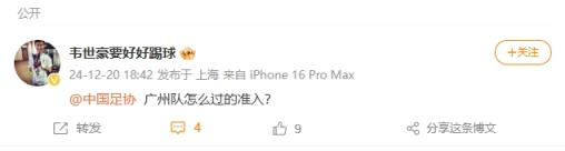 有内情?韦世豪质问中国足协:广州队怎么过的准入?